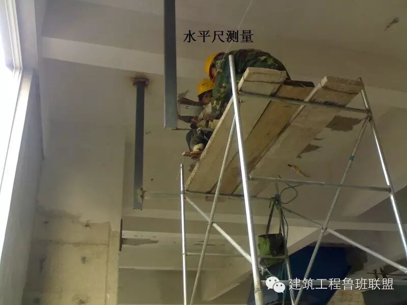4、根据土建所给标高,确定两端立柱焊接位置,立柱焊接在垫板上,焊接前使用水平尺进行检测以保证立柱垂直度。