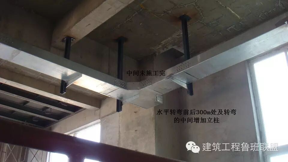 4、遇下列情况增加立柱:1)水平转弯之前、后约300~50mm处及其转弯的中间。