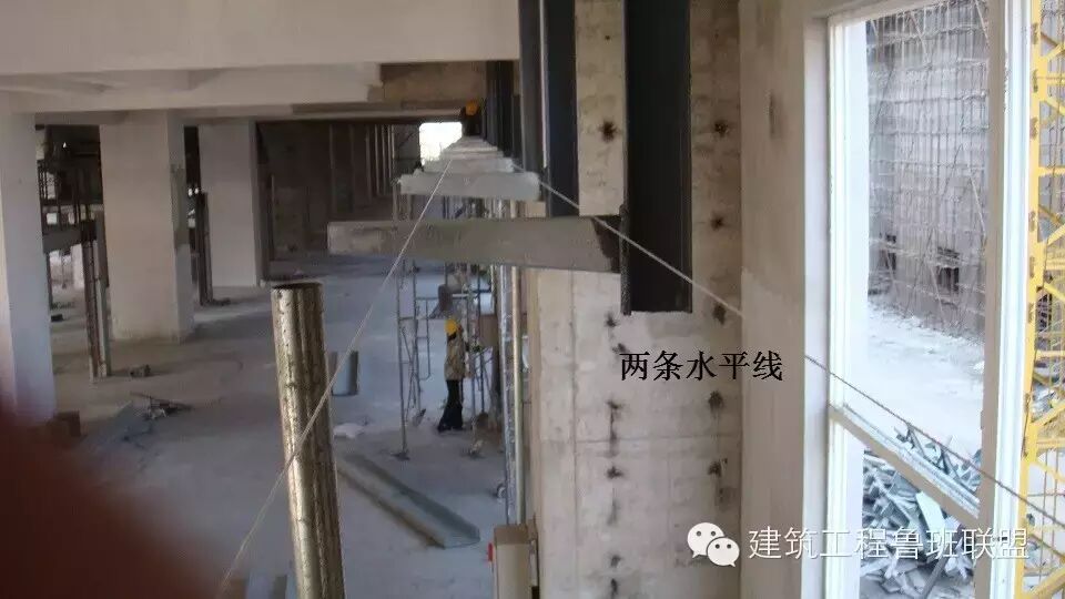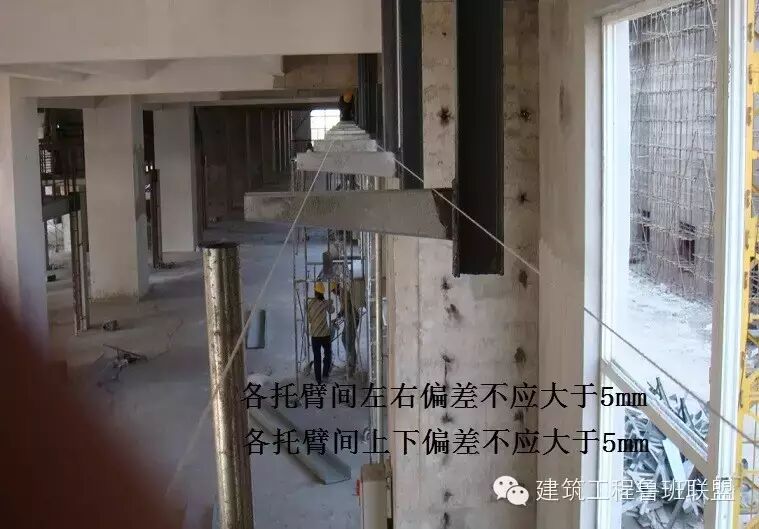 2、两端托臂焊接完后,在两端托臂上拉两条水平线,用于确定中间托臂高度,拉线要拉紧防止中间下垂。