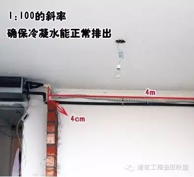 冷凝水管从内机接出后至室外或地漏,至少保持>1%的坡度。质量较高的安装则是从室内机接出后,就近落地,最后会同其他冷凝水管一起接出室外或地漏。
