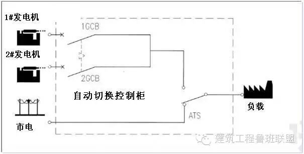 如图所示当市电中断,自动控制柜延时3秒钟起动机组,机组起动成功后,ATS自动投向机组侧,给负载供电。