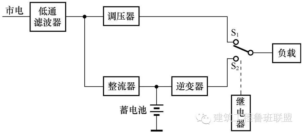 UPS工作原理如图所示:当市电正常时,UPS将市电稳压后供给负载,此时的UPS就是一台交流稳压器,同时向电池组充电,切换开关处于市电侧、;当市电中断时,继电器动作,切换开关自动投入到逆变侧,电池组的电能通过逆变器向负载供应交流电。UPS主要为计算机等电子设备提供不间断的电力供应。