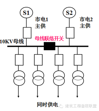 (1)平时两路高压电源同时对各自负荷供电,母线联络开关断开,当其中一路故障时,母线联络开关联通,由另一路电源供电全部负荷。此方案常用于商业楼、高级宾馆、大型办公楼,有较高的供电可靠性。