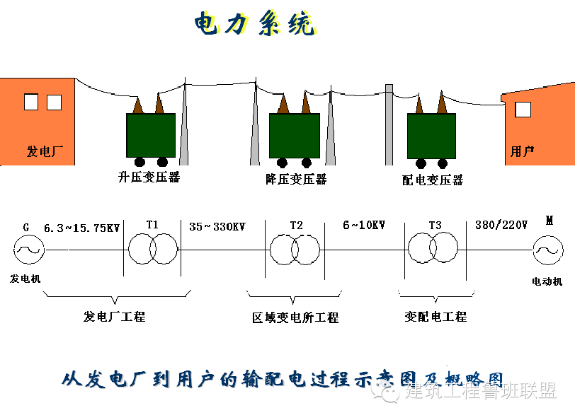 如图所示:发电厂发出电能,经升压变压器升压后,传输给区域变电站的降压变压器,再由降压变压器降压后,传输给配电变压器,最后由配电变压器将10KV电压变为380V/220v供给用户使用。