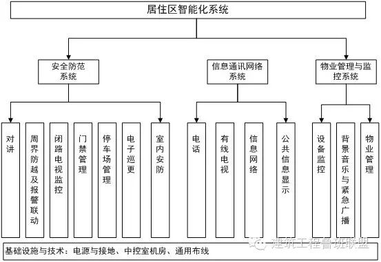 建筑智能化系统主要由安全防范系统、信息通讯网络系统、物业管理与监控系统、基础设施与技术四部分组成,具体组成如下图总结: